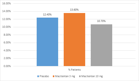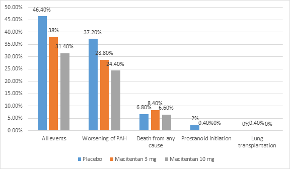 - The composite endpoint of death due to PAH or PAH-associated hospitalization occurred in 33.6%, 26% and 20.7% in placebo, macitentan 3 mg and macitentan 10 mg groups respectively.