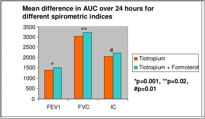- Tiotropium + Formoterol produced a significantly better mean difference in area under the curve for both FEV1 and FVC when measured over 24 hours.