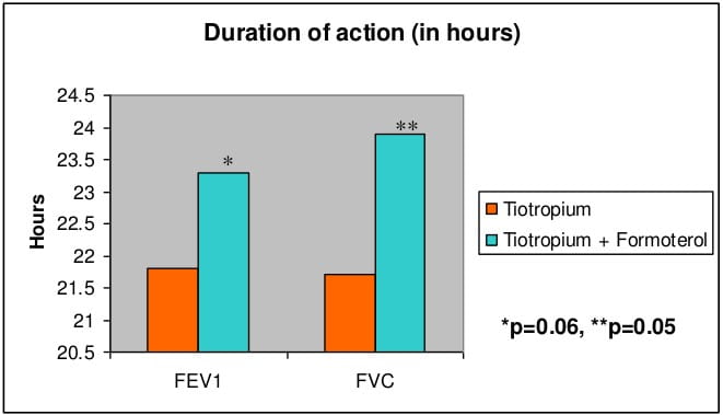 - Tiotropium + Formoterol in combination showed longer duration of action compared to Tiotropium alone.