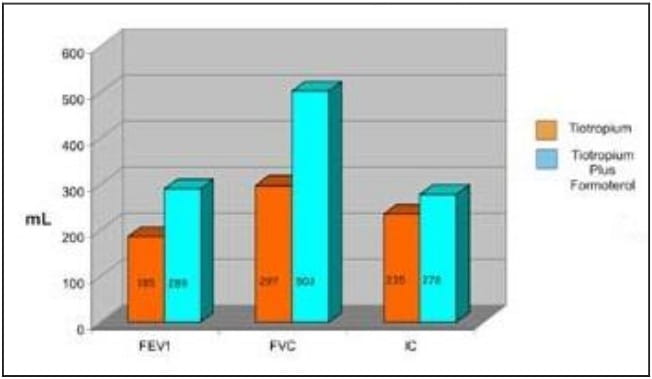 - The mean difference in the trough (24 hour values) from baseline were significantly better with Tiotropium + Formoterol in combination than Tiotropium alone