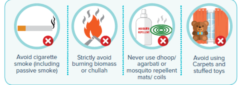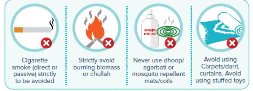 - Fumes generated by fresh paint and wood polish to be avoided as far as possible.