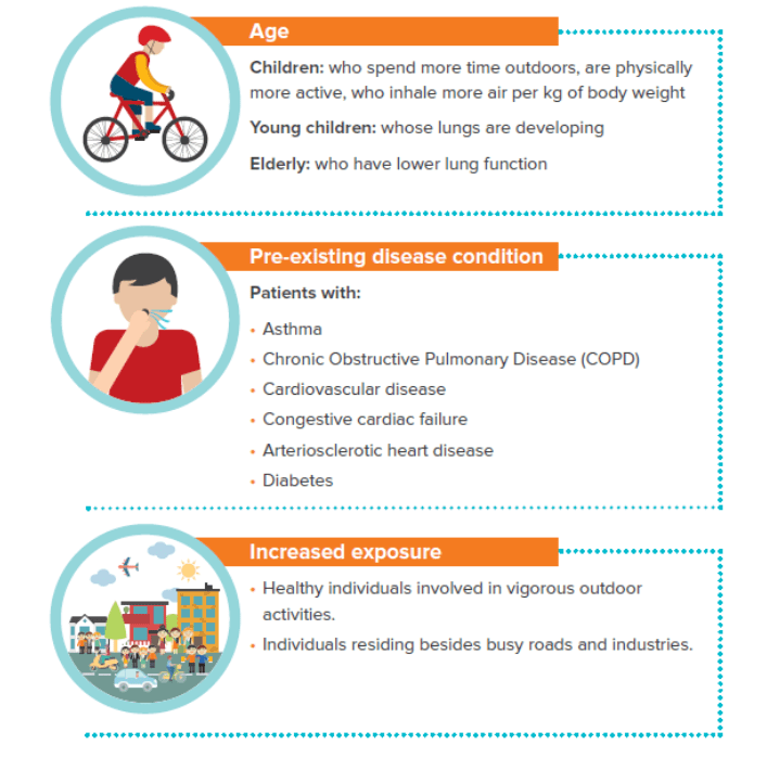 Young children, pregnant women, patients with pre-existing disease, elderly, etc, who experience elevated risks from the exposure of the pollutant are considered vulnerable groups (Table 2).