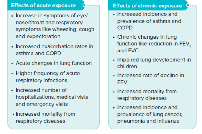 The deleterious effects of air pollution are also dependent on the level of pollutant exposure, i.e. short-term exposure or acute exposure (hours, days, or weeks) and long-term exposure or chronic exposure (months or years), (refer Table 3).