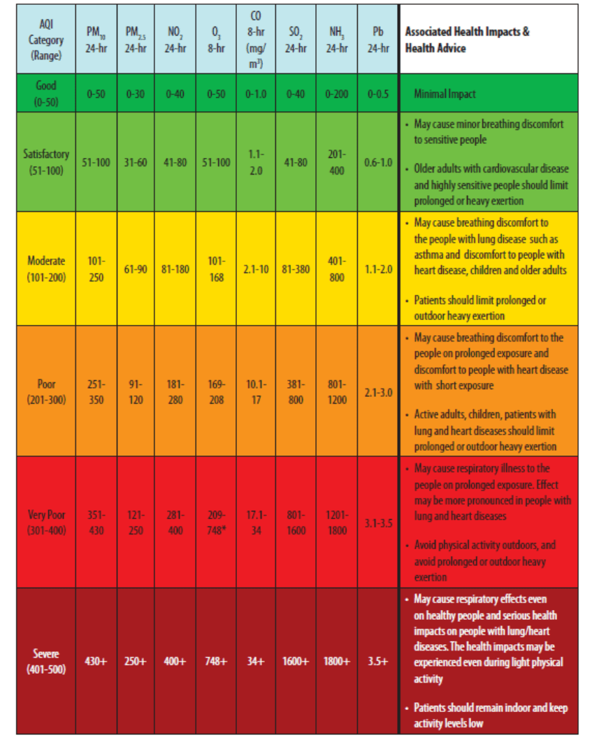 - The table below (table 4) presents the AQI breakpoints measured in microgram (or milligram in the case of CO) per cubic meter for eight air pollutants including, PM, SO2, NO2, O3, CO, along with its health impact.