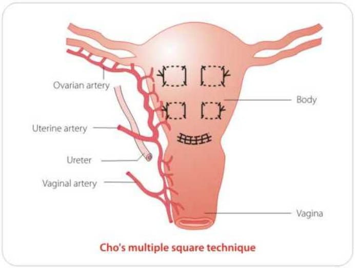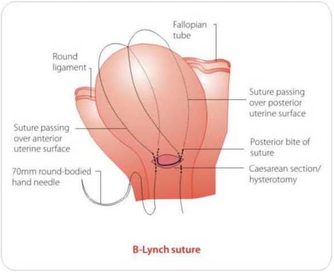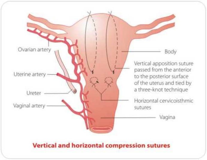 If the patient is stable and bimanual compression of the uterus has successfully achieved haemostasis, then compression sutures may be of value. Advantages are easy application of such sutures and preservation of fertility. Disadvantages the need for laparotomy. Recognised complications include erosion through the uterine wall, pyometra and uterine necrosis.