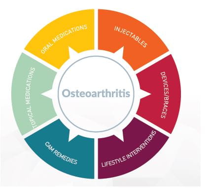 The goals of OA management are to alleviate pain, minimize loss of physical function and delay surgery. Several pharmacological and non-pharmacological interventions, in combination, help achieve these goals (Figure 6).