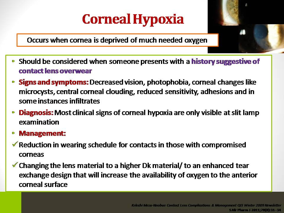 With millions of people wearing contact lenses, it is inevitable that healthcare providers will be faced with contact lens-related problems on a daily basis. The current presentation gives a brief on the diagnosis and management of various types of complications related to contact lens wear.