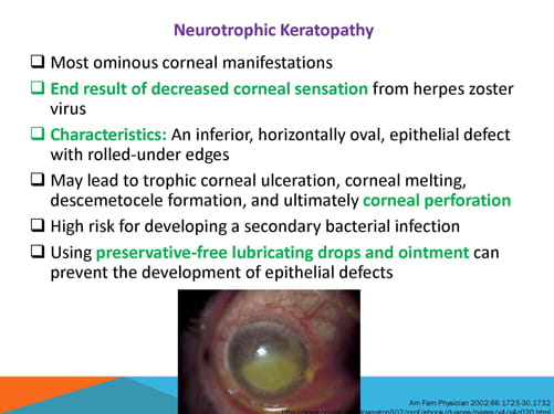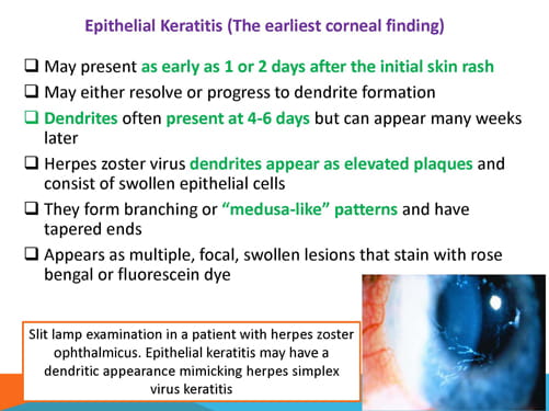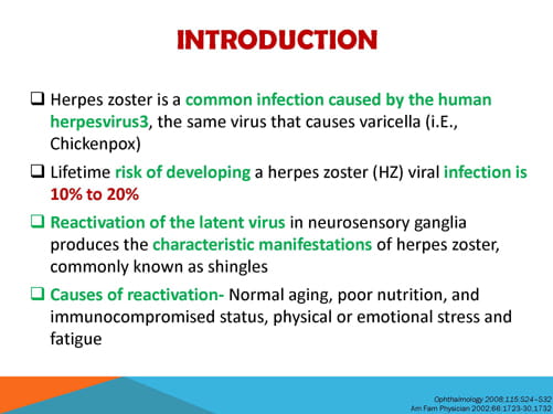 The lifetime risk of developing a herpes zoster viral infection is 10% to 20%. It can result in a variety of ophthalmic sequelae, which may be chronic and recurrent in nature. This presentation gives a brief on the ocular manifestations of herpes zoster virus as well as on the management options of the same